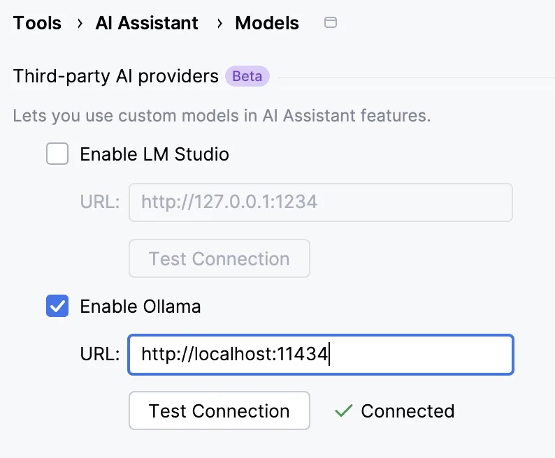 There, the Ollama integration is relatively new, and some parts are still in beta. JetBrains is offering a paid AI integration with different cloud models. The same as Copilot, I think (haven’t used it by myself). There’s also a free offering that can be used to run local models, like we want in this case. So subscribe to the free package and download the “JetBrains AI Assistant” plugin to get up and running.