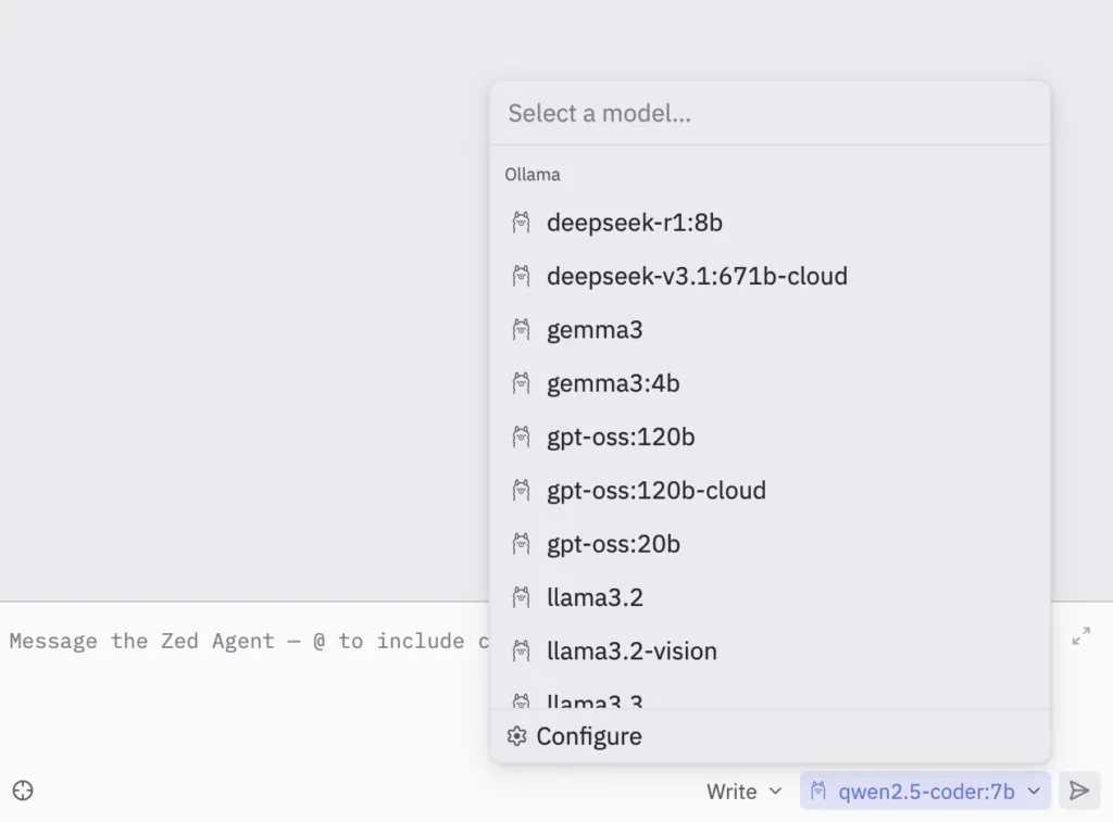 For example, in Zed, you don’t even have to do much other than install Ollama on your computer. It detects it by itself and shows you the downloaded models right away.