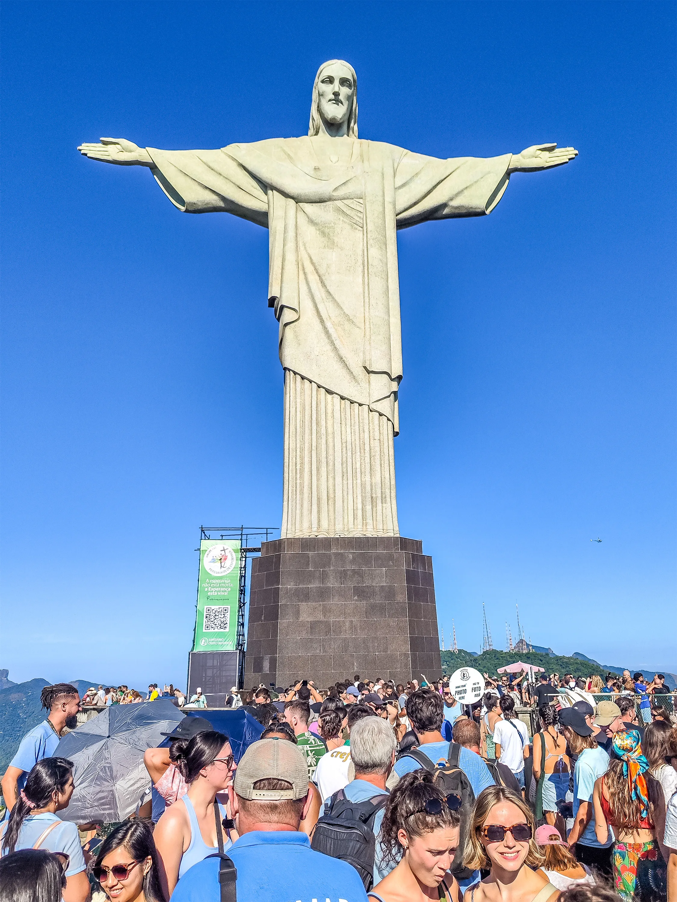 For the first full day in Rio, I planned to visit the most famous site the city has to offer: the Christ statue hovering above the city. One of the new 7 Wonders of the World. It’s actually only the 2nd world wonder I’ve seen so far. To visit two friends who joined the group I’ve explored in Buenos Aires was to be together again. My friend from Peru and another Nomad from Thailand. We went very early, as they say it’s best to have fewer people and less heat. We booked tickets online in advance with a time slot. We still had to wait quite a bit, but it was very well organised. There’s a rack railway up to the mountain. Quite steep. From there, there are some more steps to take to reach the platform with Christo. My friends and my first reaction: “The statue is so small”. It’s definitely way smaller than you’d think from pictures you see online. But impressive anyway with this statue on the top of the mountain. The view from up was my favourite and just stunning. 360-degree view of the entire city, clear skies, and great visibility.