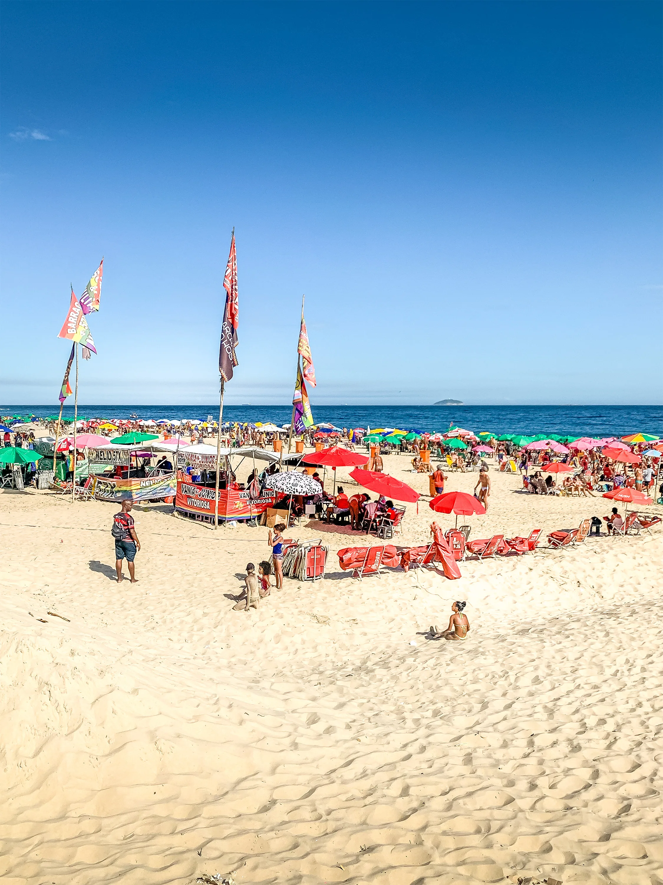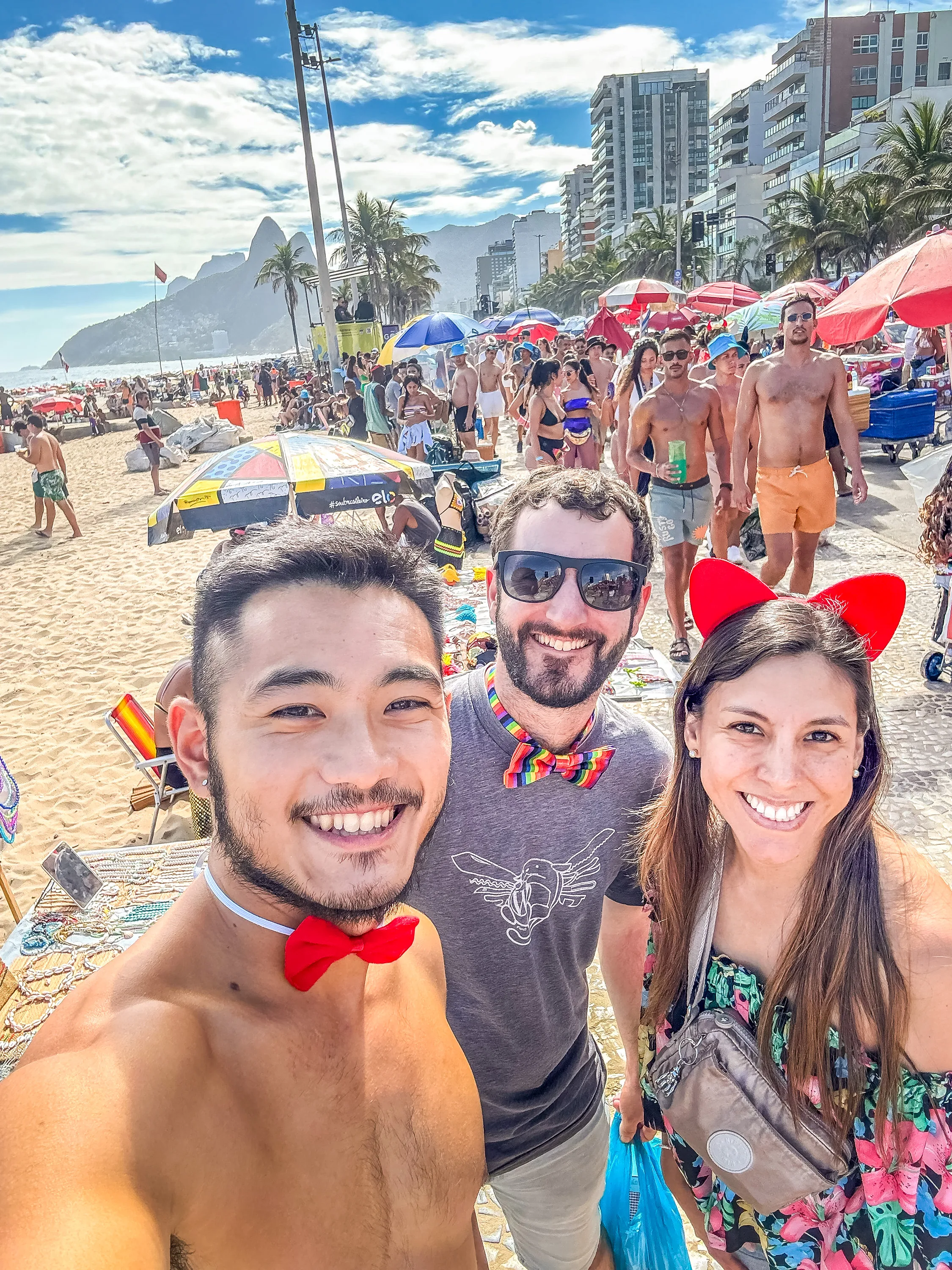 The next day, exploring the beaches around Copacabana and Ipanema was on the agenda. Since I was still quite scared to walk around with valuables like a wallet or phone, I switched to my backup phone and only brought minimal cash in the phone case. I left everything else in the hotel. Street parades in these areas were underway. Many people are on the road with costumes. My friends and I walked around a little, explored the vibes, and had a look at the beautiful, endless sandy beaches.