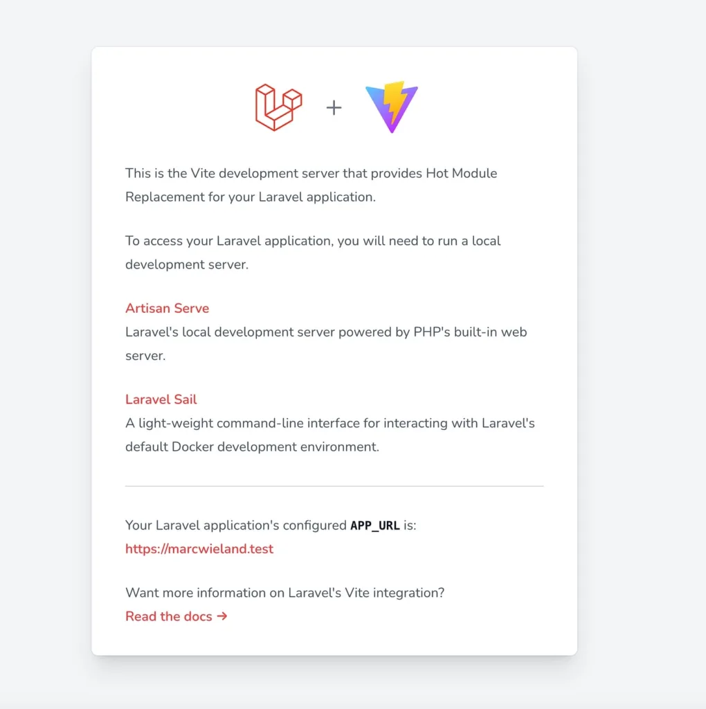 One thing we have to add to the ENV file is to set the APP_URL variable to our home URL, so the server is pointing to our actual homepage. After we set that, we can run npm run dev and Vite is spinning up everything we need. We have a Vite development server running at port 5173 (https://marcwieland.name:5173/). This is the base to make our hot module reloading work. That’s already working great if you get the following screen.