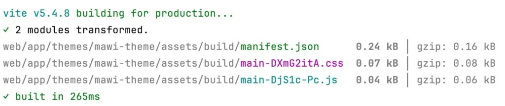 Further, I’ve been using Laravel Mix in the past. Bundling based on Webpack. Super straightforward. But this time I didn’t want to use SCSS and switch to Vite. I intended to configure Vite manually within the WordPress setup and I was struggling hard with it. At some point, I got the compilation working, but not the Hot Reloading. I absolutely wanted that. So back I am in the Laravel ecosystem. Nothing bad about it. Just confirming again what great tools they’re building and helping the open-source community. So I pulled in Laravel Vite Plugin and things started to work pretty fast.